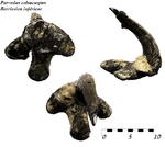 - Couronne lisse avec une petite barbelure sur la face ventrale, légèrement en avant de la pointe, et une nervure sur le bord antérieur.